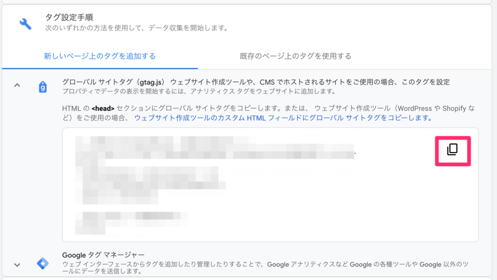 「グローバルサイトタグ」が、書いてありますので、右はじのコピーマークをクリックして、コピーしてください。